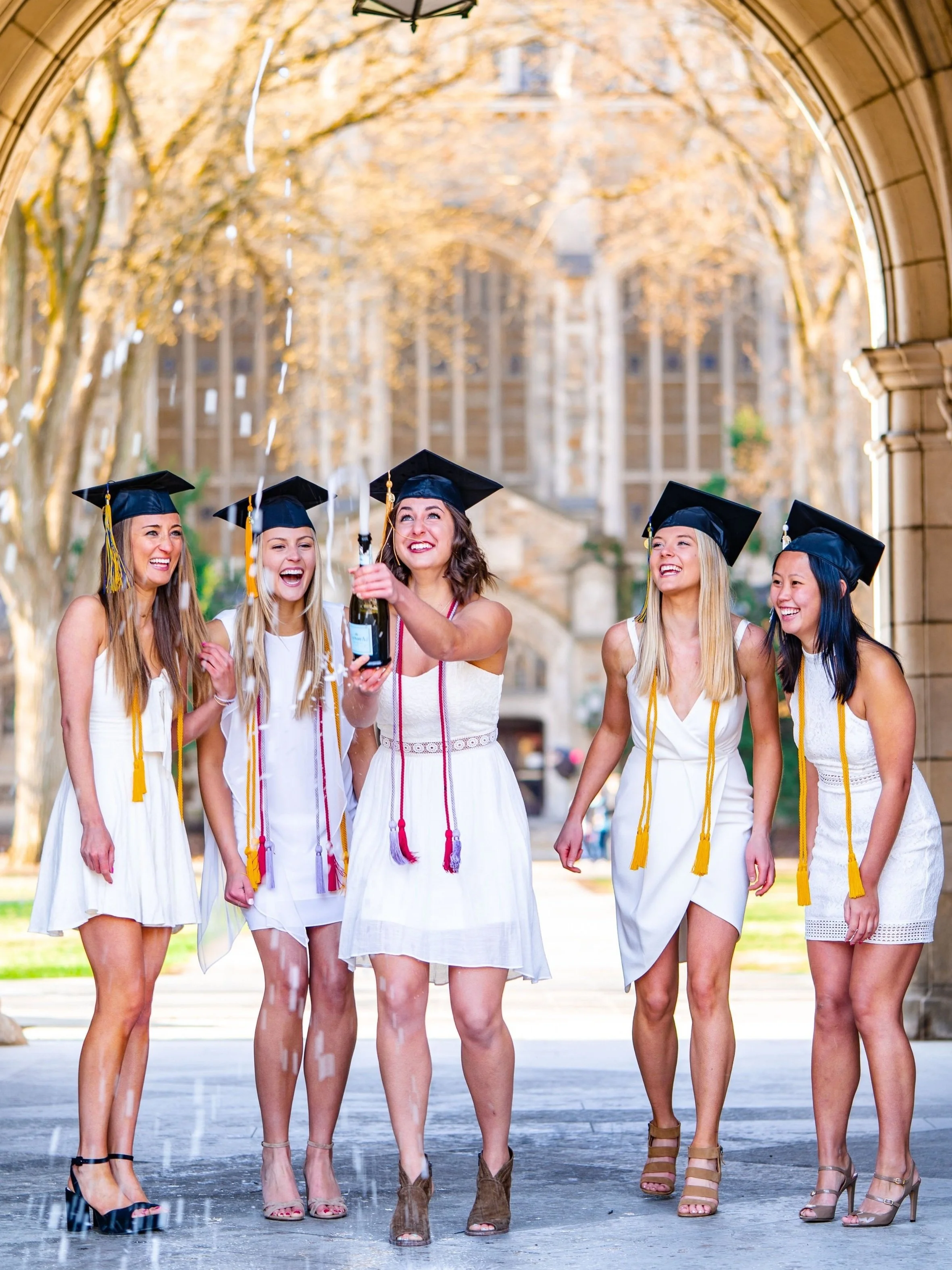 Incorporate celebration props like champagne bottles to add an unforgettable & celebratory feel to your graduation photos. Capturing moments like the champagne popping and spraying contributes action and vibrancy. Alternatively, using a pack of beer can stir up fond memories, especially when shared with friends. You’ll remember this moment forever, most likely.